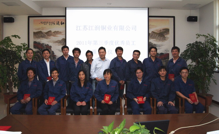 10月16日下午,在江潤銅業(yè)辦公樓一樓大會議室,總經(jīng)理駱偉棟主持召開了2011年第三季度優(yōu)秀員工表彰大會。三季度共評選出17名優(yōu)秀員工,其中15名來自生產(chǎn)一線。駱總表示,上下一心,共同努力,實現(xiàn)企業(yè)與個人的共同發(fā)展。